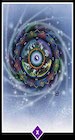 El símbolo de esta carta es una enorme rueda que representa el tiempo, el destino, el karma. Las galaxias giran alrededor de este círculo que se mueve constantemente y en cuya parte externa aparecen los doce signos del zodíaco. Dentro de la propia circunferencia figuran los ocho trigramas del I Ching, y aún más cerca del centro se encuentran las cuatro direcciones, cada una iluminada por la energía del relámpago. El triángulo giratorio está en este momento apuntando hacia arriba, hacia lo Divino, y el símbolo chino del yin-yang, femenino-masculino, receptivo y creativo, reposa en el centro del círculo. A menudo se ha dicho que lo único que no cambia en el mundo es el cambio mismo. La vida cambia constantemente, evoluciona, muere y vuelve a nacer. Todos los opuestos representan su papel en este vasto modelo circular; si te aferras al exterior de la rueda ¡Puedes marearte! Desplázate hacia el centro del ciclón y relájate, sabiendo que "esto también pasará".